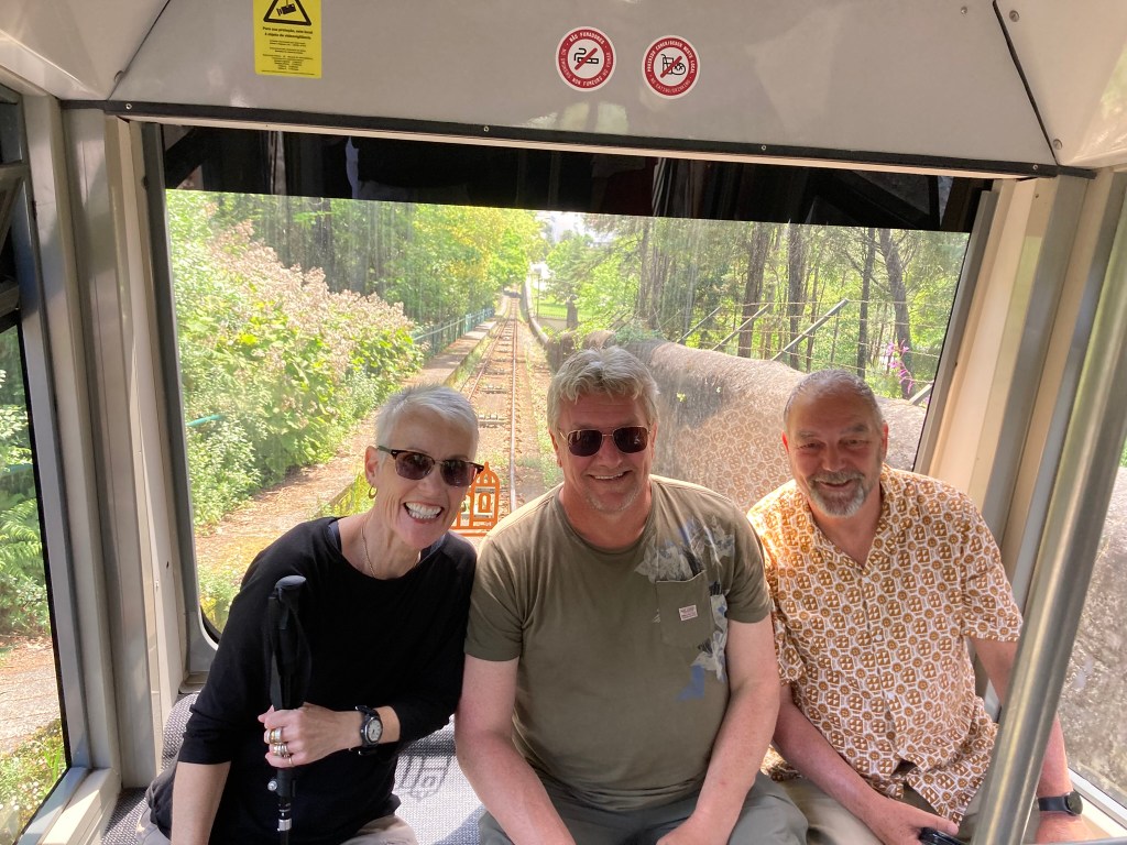 We took a funicular up Mt. Luzia to get to the holy land. Back home, we call them incline trollies. We have an incline trolley in Chattanooga. Haven’t been. We’ve ridden ones in Pittsburgh, Pennsylvania and Lake Como, Italy, though. Same concept. One car goes up the mountain while the other comes down. A cable connects them up and over a pulley like a pair of 1980’s Kabangers, but the “balls” are actually VW micro-busses packed with sweaty, unventilated tourists (mix that metaphor, and you get sweaty balls). Also, the connecting cord on the funicular is much rustier and more prone to snapping and putting out an eye out. Actually, I think funicular has a Latin etymology meaning “death plunge by way of corrosion,” but my Latin is rusty, too (rim shot).